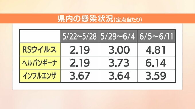 愛媛県内で報告された定点医療機関1か所あたりの患者の数は、5月下旬以降、RSウイルスとヘルパンギーナが大幅に増えています。また、インフルエンザは流行の目安とされる1を大きく超えた状態が続いています。