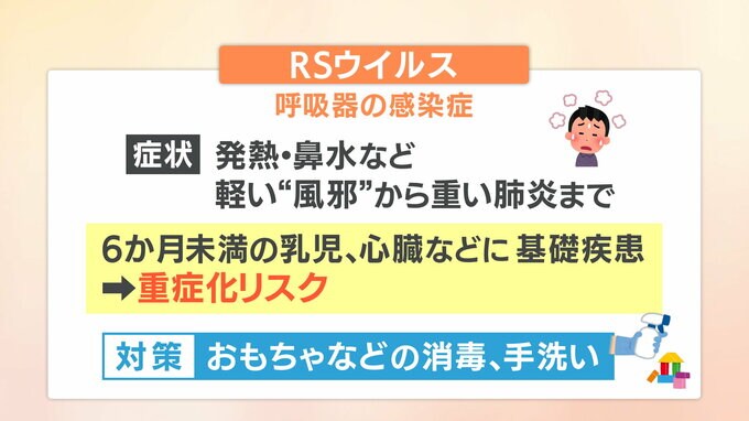 まずRSウイルスは、飛沫や接触などでうつる呼吸器の感染症です。軽い風邪症状から重い肺炎まで様々で、生後6か月未満の乳児や心臓などに基礎疾患がある子どもは重症化するリスクがあるので注意が必要です。感染予防には子どもが触れるおもちゃなどをアルコールで消毒するほか、手洗いの徹底が有効だということです。