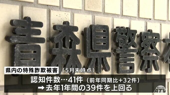 今年1月から5月末までの間に警察が青森県内で認知した特殊詐欺被害の件数は41件で去年1年間の認知件数を上回っています。青森県警察本部のまとめによりますと、2023年の特殊詐欺被害の認知件数は5月末で41件で、前…