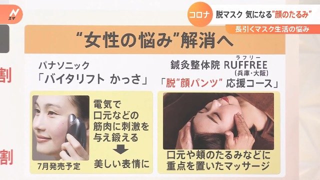 そして関西の整体院RUFFREE(ラフリー)では▼「脱“顔パンツ”応援コース」というものが人気なんだそうです。マスクを外すのが恥ずかしいことから、マスクのことを“顔パンツ ”と表現する人がいますが、こちらは口元や頬のたるみなどに重点を置いたマッサージということです。