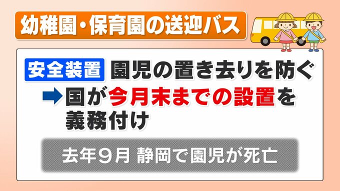 幼稚園や保育園の送迎バスで、園児の置き去りを防ぐための安全装置について、国は6月末までに、安全装置を設置するよう義務付けています。これは、22年に静岡県の認定こども園で置き去りとなった園児が死亡したことを受けたものです。
