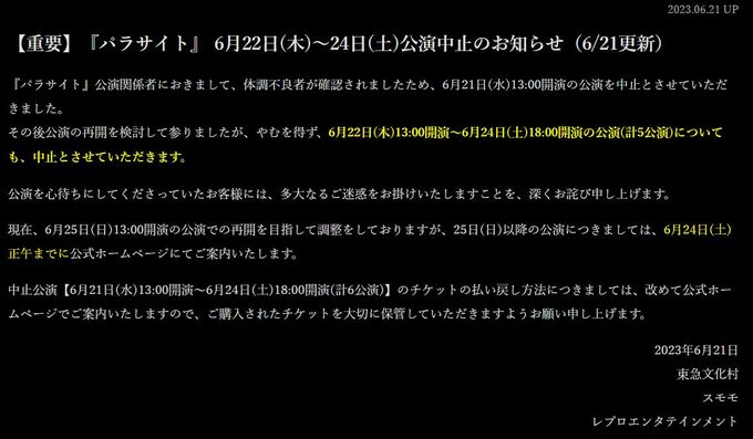 公式サイトでは「【重要】『パラサイト』 6月22日(木)~24日(土)公演中止のお知らせ」と題し「『パラサイト』公演関係者におきまして、体調不良者が確認されましたため、6月21日(水)13:00開演の公演を中止とさせていただきました」と書き出し「その後公演の再開を検討して参りましたが、やむを得ず、6月22日(木)13:00開演~6月24日(土)18:00開演の公演(計5公演)についても、中止とさせていただきます」としています。