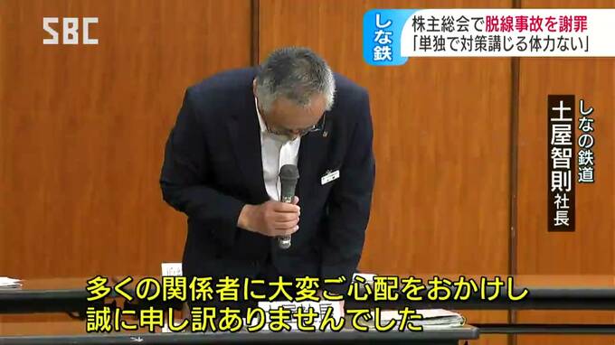 上田市で開かれたしなの鉄道の株主総会では、冒頭、土屋社長が6月12日に上田駅の構内で起きた脱線事故について謝罪しました。