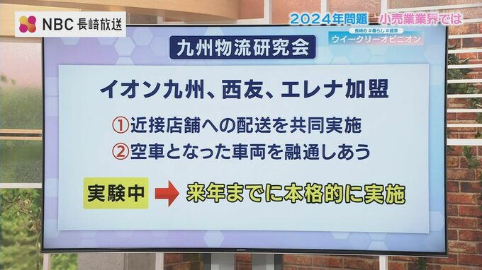 長崎県内でスーパーマーケットを展開するイオン九州、西友、エレナは『九州物流研究会』という団体を作り、近接店舗への配送を共同で行ったり、空車となった車両を融通しあえないかという実験を行っています。