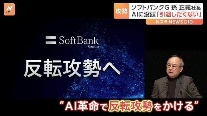 巨額赤字の続くソフトバンクグループの孫正義社長は、チャットGPTなどAI関連事業で「反転攻勢に」出ると強調しました。ソフトバンクグループ 孫 正義 社長「AIの革命がいよいよ、本格的にこれから爆発的に大き…