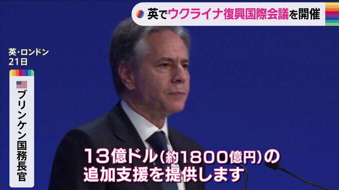 ロシアの軍事侵攻が続くウクライナの復興支援について話し合う国際会議がイギリスで開かれました。アメリカ ブリンケン国務長官「米議会の支援の下、ウクライナが目標を達成できるよう、13億ドル(約1800億円)の…