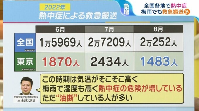 2022年のデータでは、全国的に見ると7月がピークではありますが、東京だけで見ると、8月よりも6月の方が熱中症による救急搬送の数が多くなっています。
