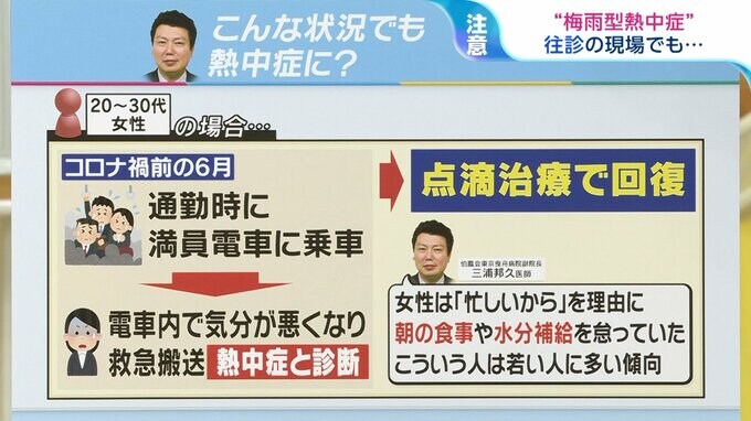 コロナ禍前の6月、20代~30代の女性が通勤時に満員電車に乗ったところ、電車の中で気分が悪くなり救急搬送。熱中症と診断されました。