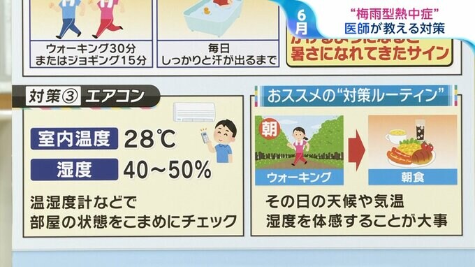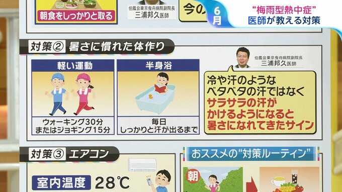 適切に汗をかいていただくということが重要です。冷や汗のようなベタベタの汗ではなく、サラサラの汗がかけるようになると暑さに慣れてきたサイン。