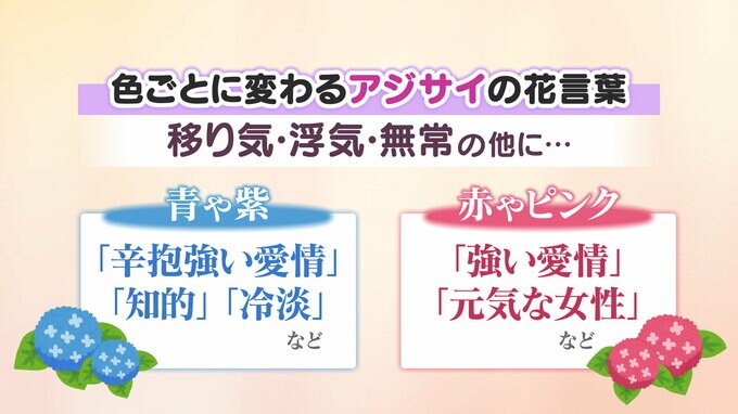 アジサイの豆知識をもう1つ。アジサイの花言葉には「移り気」や「浮気」などがありますが、色ごとに花言葉があるんです。