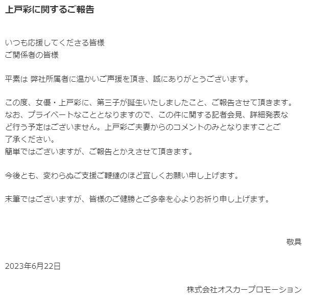 この度、⼥優・上⼾彩に、第三子が誕生いたしましたこと、ご報告させて頂きます。
