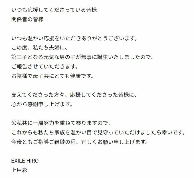 EXILE HIROさん・上戸 彩さんは、夫妻でLDH JAPANの公式サイトにコメントを発表し、「この度、私たち夫婦に、第三子となる元気な男の子が無事に誕生いたしましたので、ご報告させていただきます。お陰様で母子共にとても健康です。支えてくださった方々、応援してくださった皆様に、心から感謝申し上げます。」と、その喜びを綴っています。