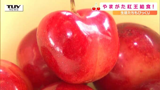あの期待の新品種が22日、山形県天童市の中学校で給食に登場しました!生徒たちもびっくりの大きさです。報告・大塚美咲「きょうの給食に登場したのは、なんとこちら!今年本格デビューしたやまがた紅王です!いや…
