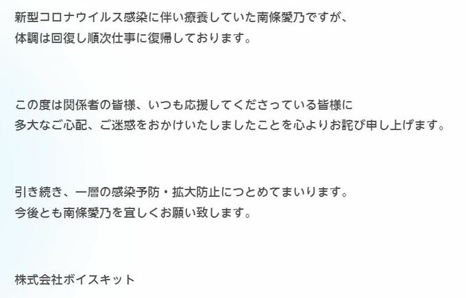 公式サイトでは「新型コロナウイルス感染に伴い療養していた南條愛乃ですが、体調は回復し順次仕事に復帰しております」と報告。合わせて「この度は関係者の皆様、いつも応援してくださっている皆様に多大なご心配、ご迷惑をおかけいたしましたことを心よりお詫び申し上げます」とお詫びの言葉も寄せています。