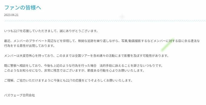また、グループの公式サイトでは、前日にも【ファンの皆様へ】と題し「最近、メンバーのプライベート周辺などを徘徊して、執拗な追跡を繰り返しながら、写真/動画撮影するなどメンバーに対する目に余る違法な行為をする男性が出現しております。」とし「メンバーは大変恐怖心を持っており、このままでは全国ツアーを含め諸々の活動にまで影響を及ぼす可能性があります。既に警察へ相談をしており、今後も上記のような行為を行った場合 法的手段に訴えることを辞さないつもりです。」と、メッセージを出しています。