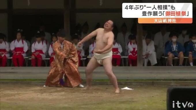 愛媛県今治市大三島の大山祇神社では、豊作を祈願する「御田植祭」が営まれ、今年の出来栄えを占う“一人角力”も4年ぶりに奉納されました。御田植祭は、大山祇神社に600年以上前から伝わる行事です。今年は4…