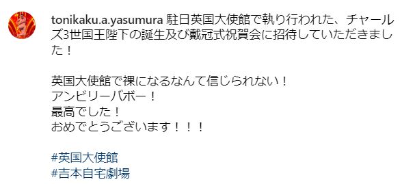 22日、お笑い芸人のとにかく明るい安村さんが自身のインスタグラムとツイッターを更新し、駐日英国大使館で開催されたチャールズ国王の誕生及び戴冠式祝賀会に招待されたことを明かしました。