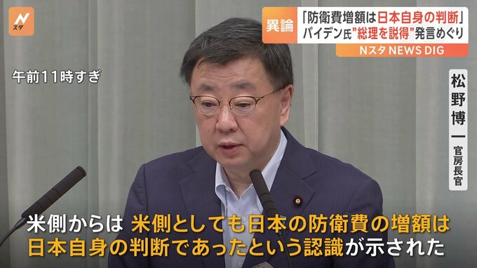アメリカのバイデン大統領が日本の防衛費の大幅な増額を自らが岸田総理に働きかけた成果だと発言したことについて、松野官房長官は「誤解を招き得るものだ」と、アメリカ側に申し入れたことを明らかにしました。バ…