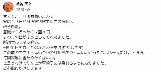 天外さんは「さてと、一旦落ち着いたんで。」と世間話のように書き出しつつ「実は19日から危篤状態で市内の病院へ救急搬送。意識かもどったのは翌20日。まわりの皆がほっとしてくれたました。」(原文ママ)と綴っています。