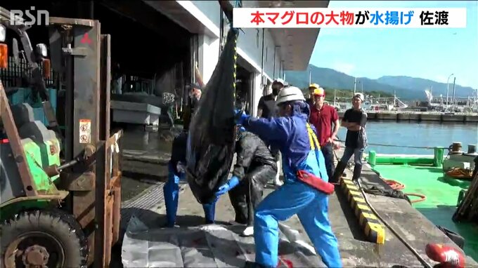 本マグロの不漁が続いていた新潟県佐渡市の両津湾で今シーズン初となる本マグロの大物が水揚げされ市場は活気づいています。魚市場に到着した一隻の船。水揚げされたのは… マグロの中でも最高級品で「本マグロ」…