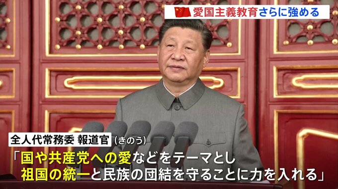 中国の国会に当たる全人代の常務委員会は「愛国主義教育法案」の審議を始めました。成立した場合、愛国教育の推進が初めて法律で規定されることになります。「愛国主義教育法案」はきょうから3日間の日程で審議が…