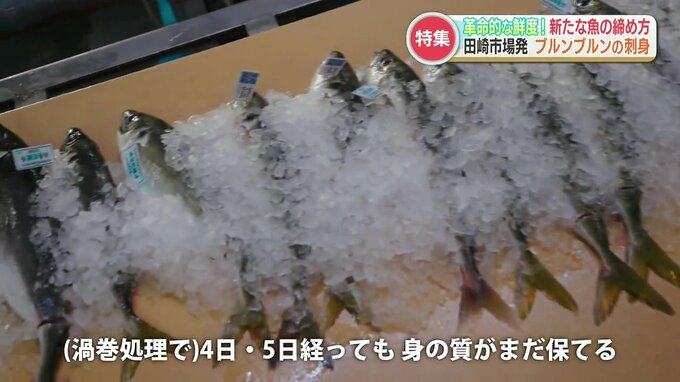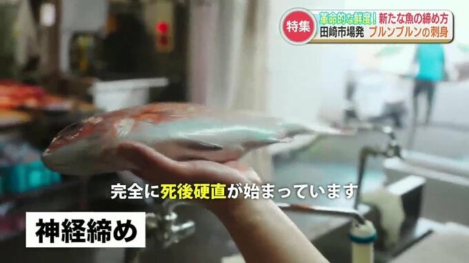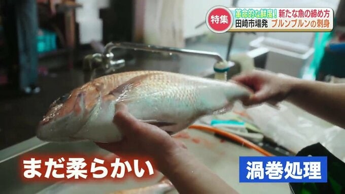神経締めの魚を見ると「こっちはもう完全に死後硬直始まってます」一方、渦巻き処理したタイはまだ柔らかい様子。
