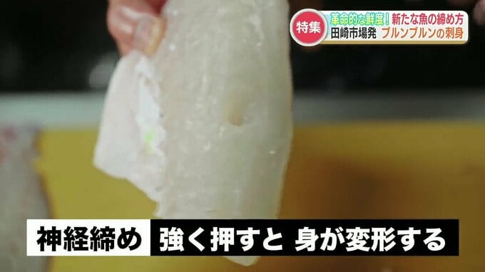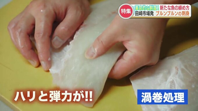 さらにさばいてみると「神経締めのタイは身が割れていく状態です。ちょっと強く押すと、もうぬかるむというか、指が入っちゃう。一方で、渦巻処理の方はまだまだ指が跳ね返ってきます」