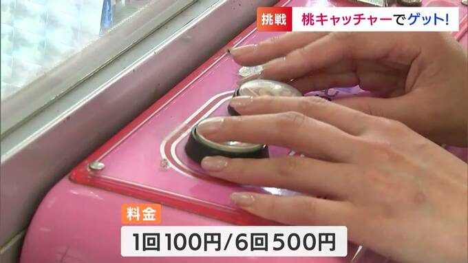 「こちらが岡山県内で初めて登場した『桃キャッチャー』です。今日入っているのは、ひと玉600円の「さくひめ」。私も自腹で挑戦してみたいと思います」