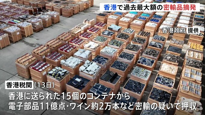 香港税関は、電子製品や高級ワインなど270億円相当を密輸した疑いで45歳の男を逮捕しました。過去最大の摘発額だということです。香港税関によりますと、今月13日、シンガポールを経由して香港に送られた15個のコ…