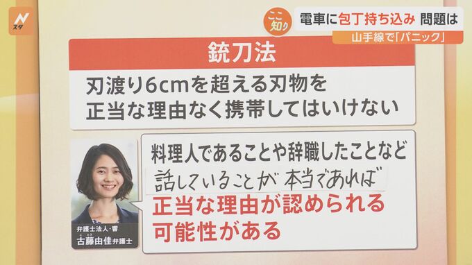 弁護士法人・響の古藤由佳弁護士によると、銃刀法に関しては「刃渡り6cmを超える刃物を、正当な理由なく携帯してはいけない」ということです。ただ、料理人であることや店を辞めたことなど、話していることが本当であれば、正当な理由が認められる可能性があるということです。
