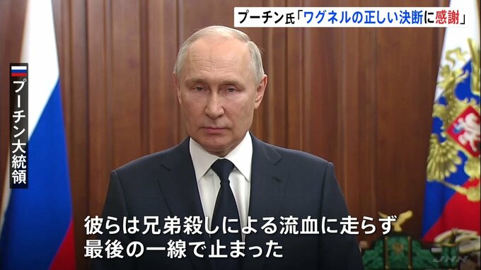 ロシアのプーチン大統領は、民間軍事会社ワグネルを率いるプリゴジン氏の反乱後、初めてとなる演説を行い、全面的な衝突が回避されたことを受け、「正しい決断をしたワグネルに感謝する」と述べました。プーチン大…