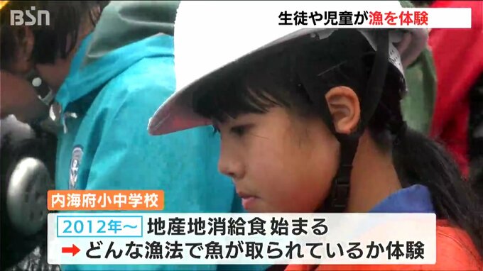 内海府小中学校では、2012年から地産地消給食に力を入れており、給食で食べている魚がどのように取られているのかを学んでもらおうと企画されました。