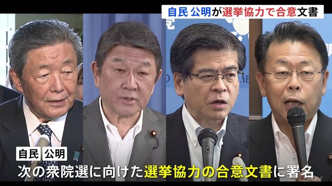 次の衆議院選挙に備えるため、自民党と公明党は選挙協力することで正式に合意しました。ただ、現時点では東京での協力は見送ります。自民・公明両党の幹事長と選挙対策委員長は次の衆議院選挙に向けた選挙協力の合…