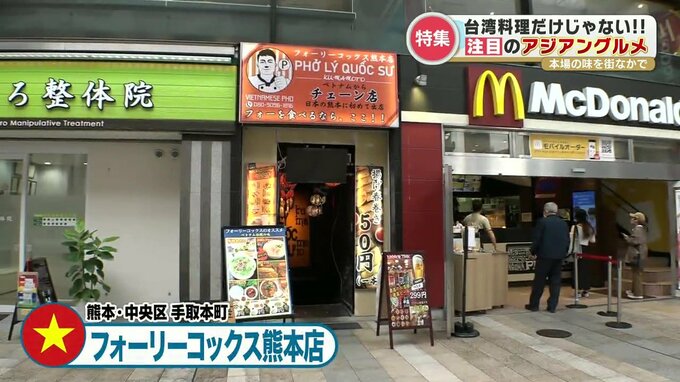 続いては、手取本町。ベトナムのソウルフード『フォー』の専門店「フォーリーコックス熊本店」。ベトナムで約60店舗を展開する超有名店で、なんと熊本店は日本第1号のお店なんです。