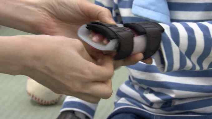 早川亜希子さん「手がどうしても皮膚に引っ張られて、指先が硬くなってしまうんで。手が丸くなってきて変形してきちゃうのを押さえて、指先を伸ばして手の変形を防ぐ装具です。小さいうちにやっていけば、やっぱり生活の質、鉛筆の持ち方とかスプーンを持てるようになると、学校生活も本人が楽しくなるんで……学校楽しいんだよね?」