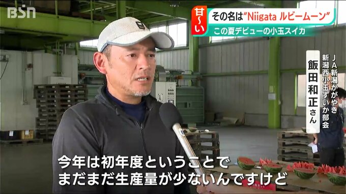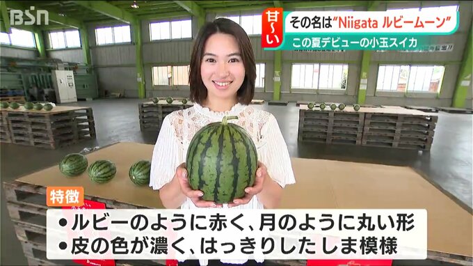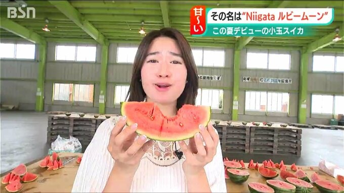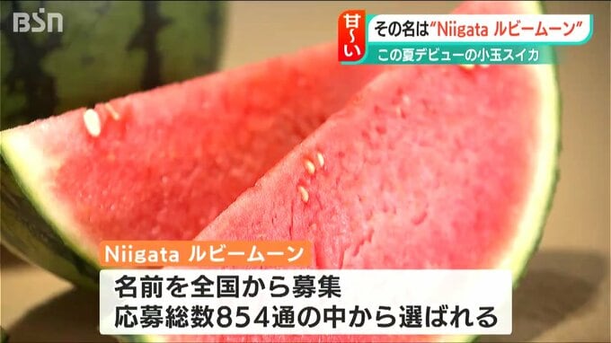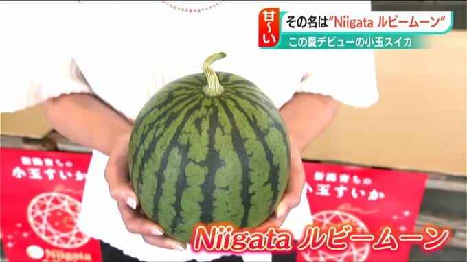 新潟市でこの夏デビューしたばかりの新品種の小玉スイカの試食会が27日、行われました。メロン並みの甘さという小玉スイカ、その名は「Niigataルビームーン」です。