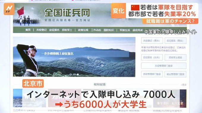 今、中国では軍への入隊を志願する大学生が増えています。首都・北京市ではインターネットで入隊を申し込んだ7000人のうち6000人が大学生でした。