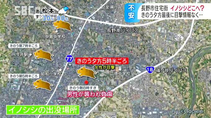 山林からは3キロ以上離れた小学校や中学校も多いエリアで、ほかにも複数の目撃情報がありましたが、26日の夜を最後にイノシシの行方はわかっていません。