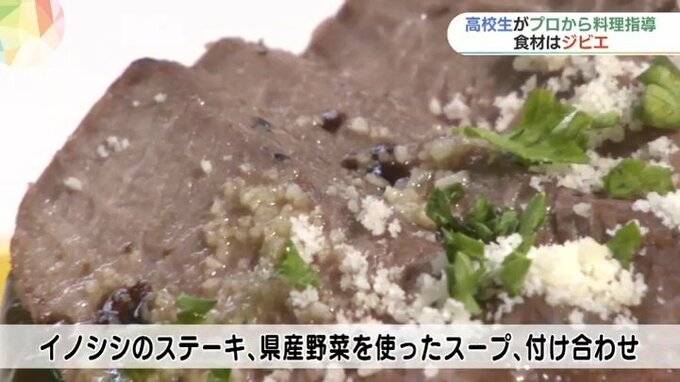 絶妙の火加減で肉をフライパンにのせると、おいしそうなにおいが広がり生徒たちからは歓声が上がりました。生徒たちがつくるのはイノシシのステーキと、山口県産の野菜を使ったスープや付け合わせです。