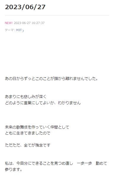 さらに、大きく行間を空けたうえで「未来の歌舞伎を作っていく仲間として ともに生きてきましたので ただただ、全てが残念です」と記しており、言葉少なに忸怩たる心境にあることを明らかにしています。