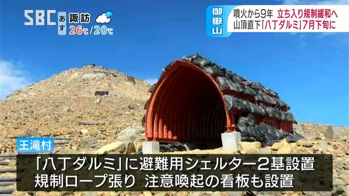 王滝村では八丁ダルミに2基の避難用シェルターを設置したほか、登山道に沿って規制ロープや注意喚起の看板を設置するとしています。