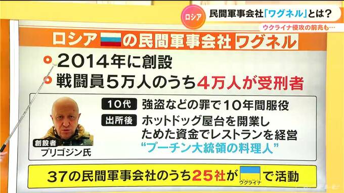 代表を務めるのがプリゴジン氏で、イギリスのメディアによりますと、10代の頃強盗などの罪で10年間服役をしていたということです。
