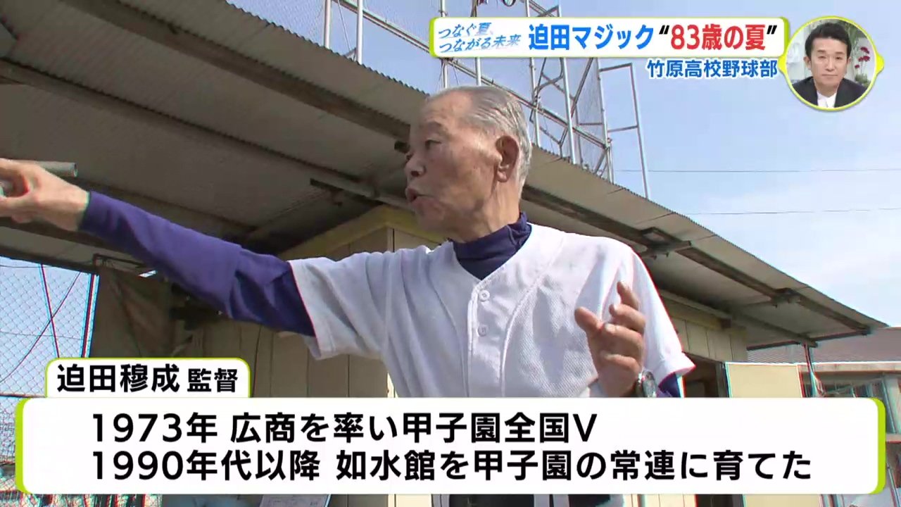 高校野球 広島大会が、7月8日に開幕します。甲子園を目指して汗を流す高校球児たちの夏を追うシリーズ「つなぐ夏、つながる未来」。今回は、83歳の名将・迫田穆成(さこだ よしあき)監督が率いる、県立竹原高校です。