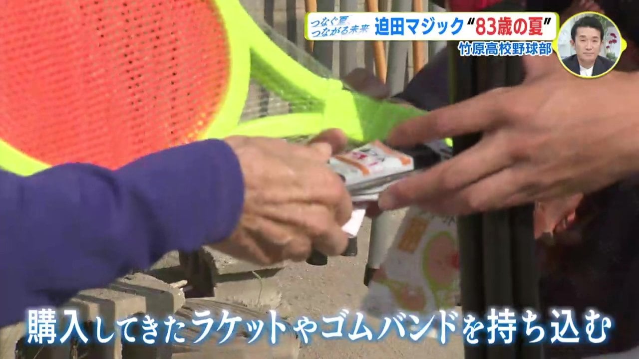 広島商業を率いて、1973年に全国制覇、如水館も甲子園の常連校に育てあげた迫田監督。83歳になった今もグラウンドに立ち続けます。選手たちに説くのは「創意工夫」。この日も自ら購入してきたゴムバンドやラケットをグラウンドに持ち込みます。