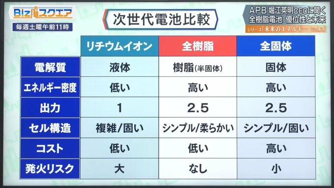 今のリチウムイオン電池は、エネルギー密度は比較的低く、発火リスクもある。それに対して、全樹脂電池はエネルギー密度が高い。