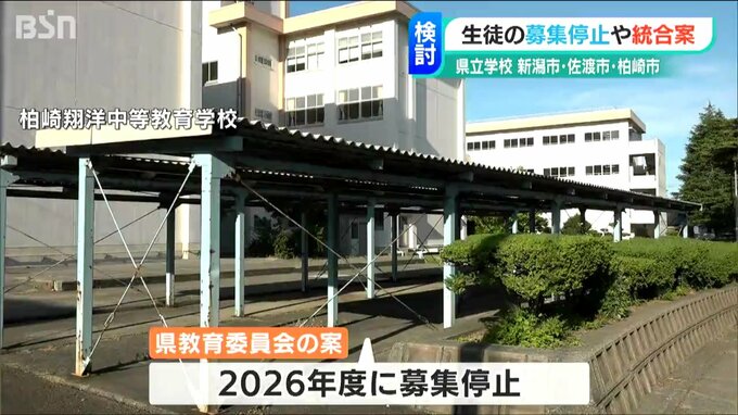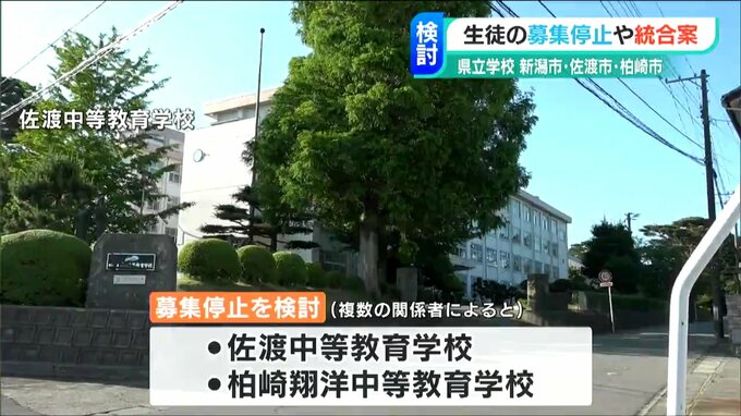 新潟県教育委員会は、2026年度に募集を停止。佐渡は、両津地域に全日制高校を開学。柏崎は、柏崎高校に県立中学を併設する案で調整を進めているということです。