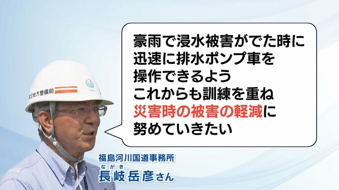 福島河川国道事務所の担当者は「豪雨で浸水被害が出たときに迅速に排水ポンプ車を操作できるよう、これからも訓練を重ね災害時の被害の軽減に努めていきたい」としています。