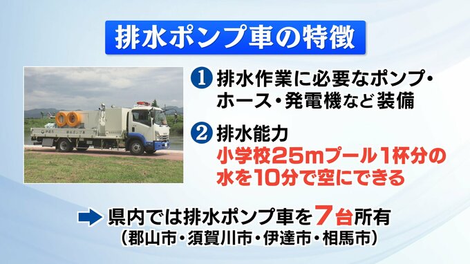 福島河川国道事務所によりますと、県内では現在、排水ポンプ車を郡山市・須賀川市・伊達市・相馬市であわせて7台所有しているということです。