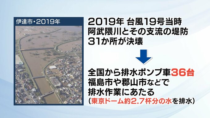 4年前の台風19号の豪雨では、阿武隈川とその支流の堤防、合わせて31か所が決壊し、福島県内の広い範囲に大きな被害をもたらしました。その際、全国から排水ポンプ車36台が福島市や郡山市などで排水作業にあたり、東京ドームおよそ2.7杯分の水を排水したそうです。