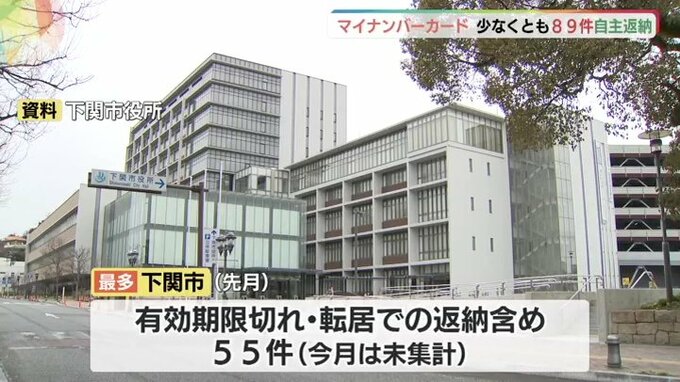 最も多かったのが下関市で、有効期限切れや転居による返納も含め先月55件。今月は集計されていません。周南市は10件で、このうち6件が情報漏えいや保険証、運転免許証との一元化への不安が理由だったということです。